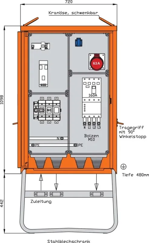 WALTHER VerteilerschrankAnschlussleistung: 111kVAnach IEC61439-4Gehäuse (H26) aus elektrolytisch-verzinktem Stahlblech mit schwermetallfreier Kunststoff-Lackierung Farbe: RAL 2004 -reinorange- mit Einfachtür, Federfallriegel für Vorhängeschloss und Griffmulde mit Kranösen und seitlichen Tragegriffen inkl. feuerverzinktem Untergestell mit Ösen für ErdnägelEinbauten bis einschließlich RCD-Schutzschalter im IsolierstoffgehäuseSchutzart: IP 44Größe ca.: 1098 x 720 x 390mm / H-B-T + Untergestell-Höhe ca.: 442mmAnschluss:1 NH1-Lasttrennschalter mit Sicherungen 160A mit Bolzenanschluss M10Abgang / Absicherung:1 Leistungsschalter mit magnetischem und thermischem Auslöser und RCD-Steuereinheit 500mA -voreingestellt- Typ: DFL 8 160-4 X-BSK -B- #9189784 mit Bolzenabgang M101 CEE-Anbaudose 63A 5P 400V 6h mit NH000-Sicherungslasttrennschalter 63A1 RCD-Schutzschalter 2P 25A/30mA -A- mit Sicherungselement 1P 16A D021 Schutzkontaktsteckdose 16A 2P 230V ohne Vorsicherung -direkt ab RCD-
