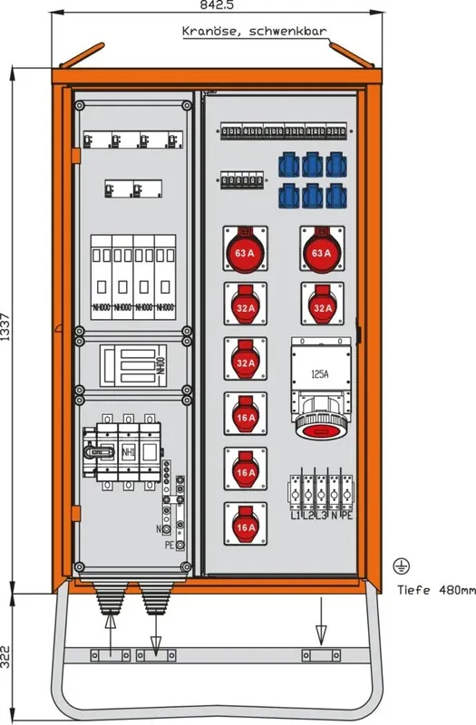 WALTHER VerteilerschrankAnschlussleistung: 139kVAnach IEC61439-4Gehäuse (H45) aus elektrolytisch-verzinktem Stahlblech mit schwermetallfreier Kunststoff-Lackierung Farbe: RAL 2004 -reinorange- mit Einfachtür, Federfallriegel für Vorhängeschloss und Griffmulde mit Kranösen inkl. feuerverzinktem Untergestell mit Ösen für Erdnägel Einbauten bis einschließlich RCD-Schutzschalter im IsolierstoffgehäuseSchutzart: IP 44Größe ca.: 1337 x 843 x 480mm / H-B-T + Untergestell-Höhe ca.: 322mmAnschluss:1 NH1-Lasttrennschalter mit Sicherungen 200A mit Bolzenanschluss M10Abgang / Absicherung:1 RCD-Schutzschalter 4P 125A/500mA -A- mit NH00-Sicherungslasttrennschalter 100A1 CEE-Anbaudose 125A 5P 400V 6h ohne Vorsicherung -direkt ab RCD-1 Abgangsklemme 5 x 16-70qmm ohne Vorsicherung -direkt ab RCD-2 RCD-Schutzschalter 4P 63A/300mA -B- mit je 1 NH000-Sicherungslasttrennschalter 63A2 CEE-Anbaudosen 63A 5P 400V 6h ohne Vorsicherungen -direkt ab RCD-1 RCD-Schutzschalter 4P 63A/30mA -B- mit NH000-Sicherungslasttrennschalter 63A3 CEE-Anbaudosen 32A 5P 400V 6h mit je 1 Leitungsschutzschalter (MCB) 3P 32A -C-3 CEE-Anbaudosen 16A 5P 400V 6h mit je 1 Leitungsschutzschalter (MCB) 3P 16A -C-1 RCD-Schutzschalter 4P 40A/30mA -A- mit NH000-Sicherungslasttrennschalter 35A6 Schutzkontaktsteckdosen 16A 2P 230V mit je 1 Leitungsschutzschalter (MCB) 1P 16A -C-
