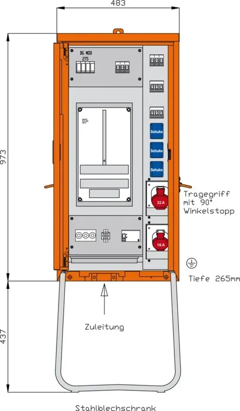 Hersteller:Walther WerkeBezeichnung:Anschlussverteilerschrank 24kVA, 5 LSTyp:WAV0100-OE3Ausführung:AnschlussverteilerschrankBemessungsspannung:230/400 VBemessungsstrom:35 AAnschlussleistung:24 kVAAnzahl der CEE-Steckdosen 16 A / 400 V / 5-polig:1Anzahl der CEE-Steckdosen 32 A / 400 V / 5-polig:1Anzahl der SCHUKO-Steckdosen:3Anzahl der Zählerfelder:1Hauptschalter:sonstigeHauptschalter-Bemessungsstrom:35 AAnzahl der Pole Hauptschalter:3Anzahl der Leitungsschutzschalter:5Fehlerstrom-Typ:AAnzahl der Fehlerstrom-Schutzschalter 30 mA:1Notschalter:neinSchutzart (IP):IP44Geeignet nach IEC/EN 61439-4:jaWerkstoff des Gehäuses:StahlBreite:483 mmHöhe:1410 mmTiefe:265 mm