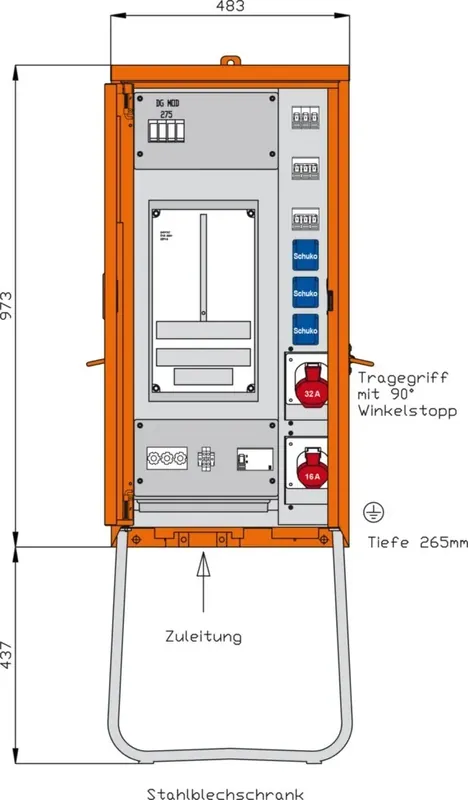 Hersteller:Walther WerkeBezeichnung:Anschlussverteilerschrank 24kVA, 5 LSTyp:WAV0100-OE2Ausführung:AnschlussverteilerschrankBemessungsspannung:230/400 VBemessungsstrom:35 AAnschlussleistung:24 kVAAnzahl der CEE-Steckdosen 16 A / 400 V / 5-polig:1Anzahl der CEE-Steckdosen 32 A / 400 V / 5-polig:1Anzahl der SCHUKO-Steckdosen:3Anzahl der Zählerfelder:1Hauptschalter:sonstigeHauptschalter-Bemessungsstrom:35 AAnzahl der Pole Hauptschalter:3Anzahl der Leitungsschutzschalter:5Fehlerstrom-Typ:AAnzahl der Fehlerstrom-Schutzschalter 30 mA:1Notschalter:neinSchutzart (IP):IP44Geeignet nach IEC/EN 61439-4:jaWerkstoff des Gehäuses:StahlBreite:483 mmHöhe:1410 mmTiefe:265 mm