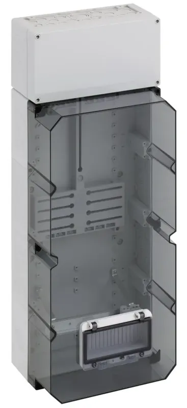 Zählergehäuse, mit transparentem Deckel, serienmäßig plombierbar, mit montiertem Zählerkreuz für Drehstromzähler und Zählerbefestigungsschrauben, mit zusätzlichem Klappfenster zur Bedienung eines selektiven Hauptschalters, mit 35mm Normschiene zum Einbau eines selektiven Hauptschalters, inkl. 2 einpoligen HA-Klemmen 25/16mm² für N und PE, mit zusätzlichem Anschlussraum 150mm oben, mit 35mm Normschiene, mit Doppelmembranstutzen, Verschluss- und Isolierstopfen, Abmessungen: 300 x 750 x 210mm