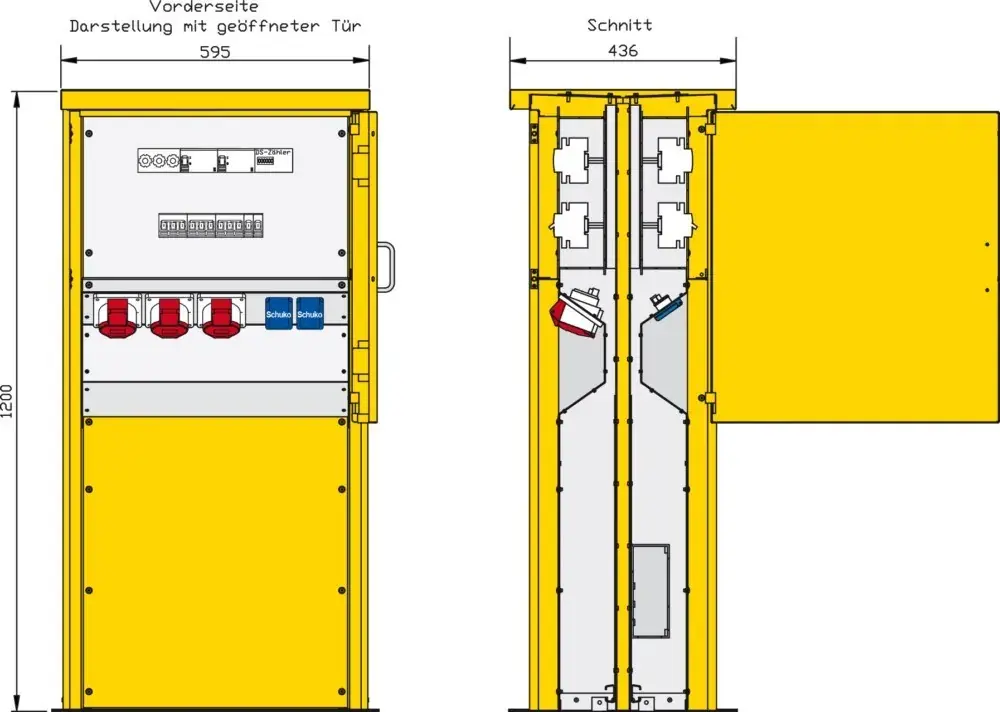 Hersteller:Walther WerkeBezeichnung:Energiesäule 4 RCDs TypA, 10 LSTyp:84481016Ausführung:EndverteilerschrankBemessungsspannung:230/400 VBemessungsstrom:125 AAnschlussleistung:87 kVAAnzahl der CEE-Steckdosen 16 A / 400 V / 5-polig:4Anzahl der CEE-Steckdosen 32 A / 400 V / 5-polig:2Anzahl der SCHUKO-Steckdosen:4Hauptschalter:DIIIHauptschalter-Bemessungsstrom:63 AAnzahl der Pole Hauptschalter:3Anzahl der Leitungsschutzschalter:10Fehlerstrom-Typ:AAnzahl der Fehlerstrom-Schutzschalter 30 mA:4Notschalter:neinSchutzart (IP):IP44Geeignet nach IEC/EN 61439-4:neinWerkstoff des Gehäuses:sonstigeBreite:595 mmHöhe:1200 mmTiefe:436 mm