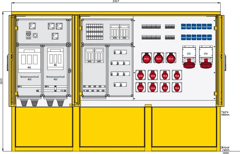 Hersteller:Walther WerkeBezeichnung:Indus .u. Marktplatzvert. 1 Wandlersatz 630/5ATyp:83216400Ausführung:VerteilerschrankBemessungsspannung:230/400 VBemessungsstrom:630 AAnschlussleistung:436 kVAAnzahl der CEE-Steckdosen 16 A / 400 V / 5-polig:4Anzahl der CEE-Steckdosen 32 A / 400 V / 5-polig:4Anzahl der CEE-Steckdosen 63 A / 400 V / 5-polig:3Anzahl der CEE-Steckdosen 125 A / 400 V / 5-polig:2Anzahl der SCHUKO-Steckdosen:12Hauptschalter:NH3Hauptschalter-Bemessungsstrom:630 AAnzahl der Pole Hauptschalter:3Anzahl der Leitungsschutzschalter:20Fehlerstrom-Typ:AAnzahl der Fehlerstrom-Schutzschalter 30 mA:5Anzahl der Fehlerstrom-Schutzschalter 300 mA:5Notschalter:neinSchutzart (IP):IP44Geeignet nach IEC/EN 61439-4:neinWerkstoff des Gehäuses:sonstigeBreite:2417 mmHöhe:1613 mmTiefe:480 mm