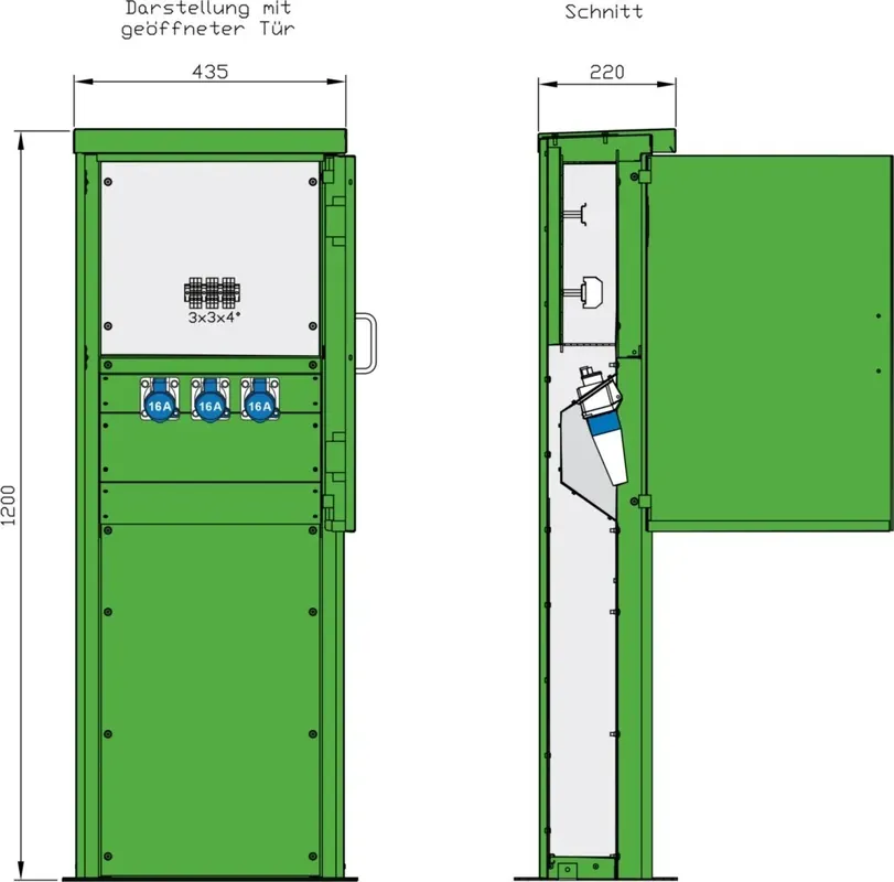 Hersteller:Walther WerkeBezeichnung:Satellitensäule 3 CEE-Abgängen 16ATyp:84301300Ausführung:EndverteilerschrankBemessungsspannung:230 VBemessungsstrom:16 AAnschlussleistung:3,7 kVAAnzahl der CEE-Steckdosen 16 A / 230 V / 3-polig:3Hauptschalter:ohneHauptschalter-Bemessungsstrom:0 ANotschalter:neinSchutzart (IP):IP44Geeignet nach IEC/EN 61439-4:neinWerkstoff des Gehäuses:sonstigeBreite:435 mmHöhe:1200 mmTiefe:220 mm