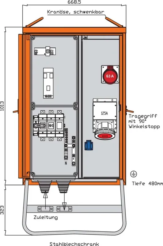 WALTHER VerteilerschrankAnschlussleistung: 87kVAnach IEC61439-4Gehäuse (H20) aus elektrolytisch-verzinktem Stahlblech mit schwermetallfreier Kunststoff-Lackierung Farbe: RAL 2004 -reinorange- mit Einfachtür, Federfallriegel für Vorhängeschloss und Griffmulde mit Kranösen und seitlichen Tragegriffen inkl. feuerverzinktem Untergestell mit Ösen für ErdnägelEinbauten bis einschließlich RCD-Schutzschalter im IsolierstoffgehäuseSchutzart: IP 44Größe ca.: 1013 x 669 x 480mm / H-B-T + Untergestell-Höhe ca.: 323mmAnschluss:1 NH1-Lasttrennschalter mit Sicherungen 125A mit Bolzenanschluss M10Abgang / Absicherung:1 RCD-Schutzschalter 4P 125A/500mA -B-1 CEE-Anbaudose 125A 5P 400V 6h ohne Vorsicherung -direkt ab RCD-1 CEE-Anbaudose 63A 5P 400V 6h mit NH000-Sicherungslasttrennschalter 63A1 RCD-Schutzschalter 2P 25A/30mA -A- mit Sicherungselement 1P 16A D021 Schutzkontaktsteckdose 16A 2P 230V ohne Vorsicherung -direkt ab RCD-